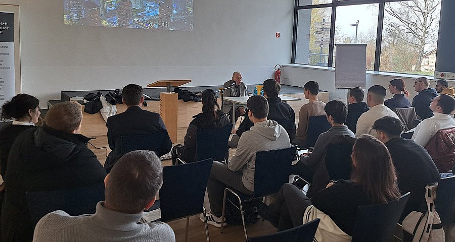Berufsfachschulklassen am 22.1,2025 im Gespräch mit Gerhard Wiese, Staatsanwalt der Auschwitzprozesse. Videoaufzeichnung auf youtube-Kanal.